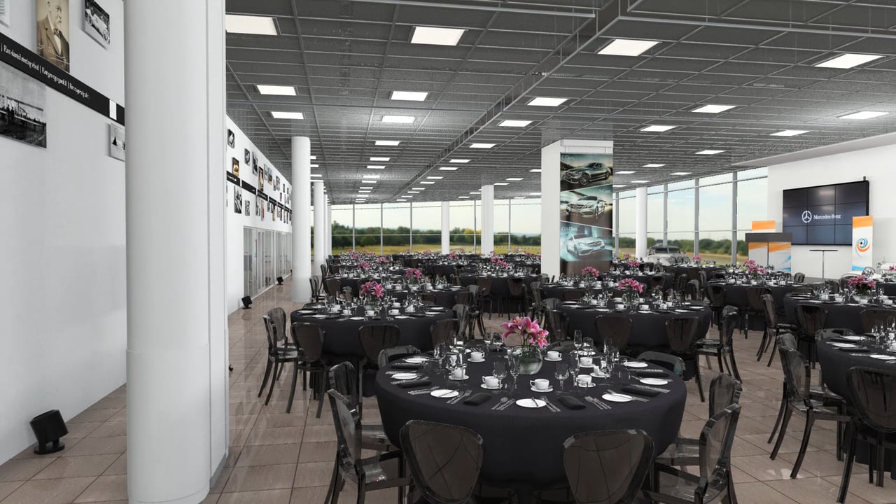 CGI walkthrough animation of the main exhibition floor at Mercedes-Benz World, UK